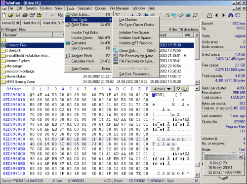 WinHex - универсальный HEX-редактор. Как редактор дисков позволяет работать с жесткими дисками, дискетами, CD-ROM, DVD, ZIP, Smart Media, Compact Flash memory cards и прочими носителями, при этом поддерживается FAT12, FAT16, FAT32, NTFS, CDFS.