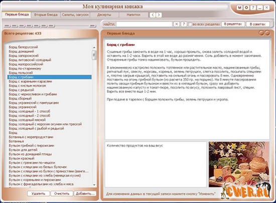 2000 кулинарных рецептов и более 1000 советов - вам мало? Добавьте в кулинарную книжку любимые рецепты сами. Эта программа - не только сборник кулинарных рецептов, это именно ТВОЯ кулинарная книжка, рецепты в которую будешь добавлять именно ты. Храни все рецепты в одном месте, а программа «My Cookery Book» поможет тебе в этом.