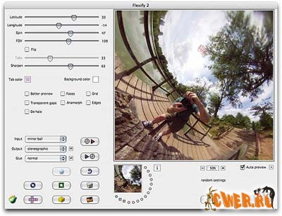 Предлагаю вашему вниманию очень мощный плагин для Photoshop, который позволяет создавать эффекты линзы для панорамных изображений. Умеет конвертировать все основные представления сферических панорам, а также выводит картинки еще в нескольких десятках форматов. Всего во Flexify имеется более 40 вариантов представления конечного изображения