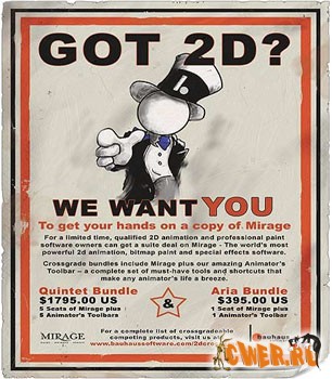 Bauhaus Mirage — это мощный пакет для создания 2D-анимации и спецэффектов, который существенно снижает трудоемкость разработки 2D-анимированного контента. Продукт предлагает средства комбинирования инструментов рисования, работы с цветом, анимации, видео и спецэффектов в одной удобной среде разработки. Mirage представляет собой единую среду для создания различных видов анимации. Все то, что аниматор создает в обычной студии, — от раскадровки сюжета до финального проекта — может быть сделано в среде Mirage на базе цифровых технологий.