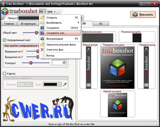 True BoxShot - программа для создания трехмерных графических изображений коробок для софта, клубных карт, компакт-дисков, DVD-коробочек. Успех продукта во многом зависит от его упаковки и презентации потребителям - это закон рынка. Для компьютерных программ так называемая упаковка и презентация делаются с помощью боксов. Боксы - это первая вещь, на которую обращает внимание покупатель при выборе программы. Дальше идет презентация программы, посредством которой покупатель может лучше ознакомиться с программой, что оставляет позитивное впечатление у него. Качественные картинки, создаваемые с помощью True BoxShot делают виртуальную презентацию любого продукта особенно привлекательной и запоминающейся.