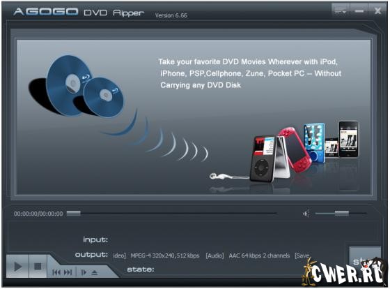Agogo DVD Ripper это удобная программа, которая позволит вам сконвертировать любимый DVD диск в один из следующих форматов: DivX, XviD, AVI, iPod, PSP, 3GP, Pocket PC, VCD, SVCD. Программа очень проста в использовании – всего пару щелчков мыши, вы выбираете субтитры, аудио-дорожки и редактируете качество аудио и видео.