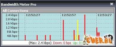 Bandwidth Meter Pro - это простая в использовании сетевая программа для слежения и подготовки отчетов о коэффициенте использования полосы частот. Программа следит за трафиком всех сетевых соединений на Вашем компьютере и отображает графическую и числовую скорость скачивания и загрузки в реальном времени. Программа записывает в журнал коэффициент использования полосы частот и выдаёт информацию о том, сколько полос частот было использовано каждым сетевым соединением на Вашем компьютере каждый день, неделю и месяц. Bandwidth Meter Pro работает со всеми типами сетевых соединений, включая модем, ISDN, DSL, ADSL, кабельный модем, беспроводные сетевые карты, карты Ethernet и другие.