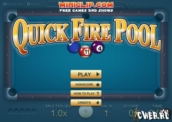 Весьма неплохо реализованная во флеше игра в пул. Имеется возможность подкручивания битка. Игра ограничена по времени, но при попадании в лузы пяти шаров подряд, время увеличивается, а при попадании битка, наоборот уменьшается. После достижения пятого уровня, появляется функция отключения подсказки.