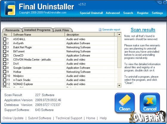 Final Uninstaller offers a new and better way to make your PC run more efficiently by cleaning up files and registry entries that were left after unsuccessful uninstallation. The program is based on a powerful leftovers database to support many functions of thoroughly scanning your computer, intelligently detecting leftover files of various programs, clearly listing applications that can be removed and completely uninstalling with only one click… This easy-to-use Final Uninstaller allows you to say goodbye to nerve-wracking leftovers and to speed up you PC performance.