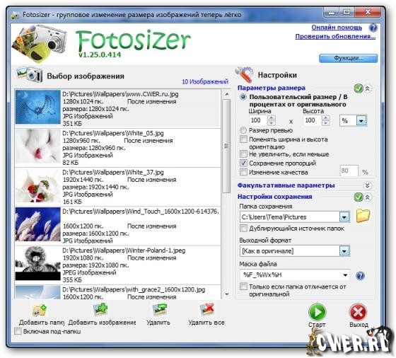 Программа Fotosizer предназначена для пакетной обработки графических изображений, а именно изменения их размеров. Программа позволяет за раз обрабатывать сразу большое количество картинок (целые директории), поддерживаются .JPG, .JPEG, .PNG, .BMP и .GIF форматы.