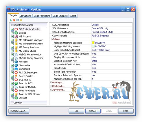 - Включает форматирование и улучшение кода; проверка синтаксиса SQL, кодовой структуры для удобной и быстрой навигации по коду и многое другое...