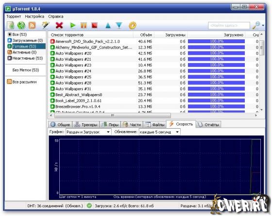 µTorrent - компактный BitTorrent-клиент с поддержкой одновременной загрузки сразу нескольких файлов, настраиваемой полосой пропускания, быстрым восстановлением прерванной загрузки и небольшим использованием памяти.