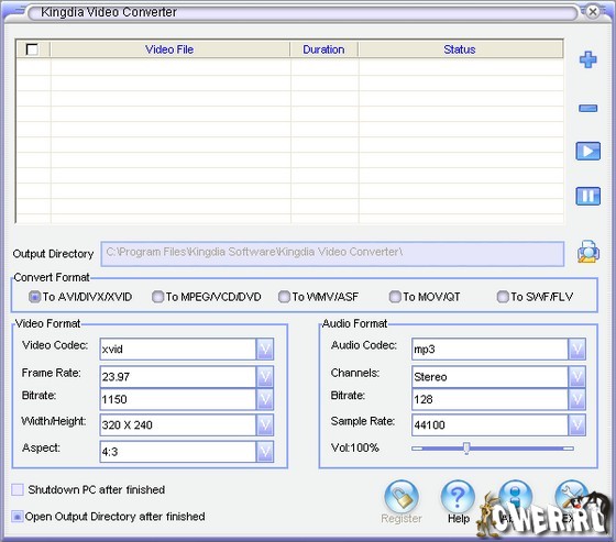 Kingdia Video Converter is an all-in-one video converter application, which, is more powerful and conversion from videos toAVI (DivX, XviD, etc.), DV AVI, MP4 (inc. Sony PSP, Apple iPod, Archos DVR, Creative Zen), WMV, 3GP, 3G2, QuickTime (MOV, QT), SWF, DVD, VOB, VRO, MPEG 1,2, MPG, DAT, VCD, SVCD, ASF, MJPEG, H.263, H.264, Real Video (RM, RMVB), DVR-MS,MKV. Very user-friendly interface and easy to use. Very quick in conversion speed and no quality is lost!