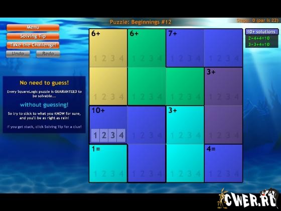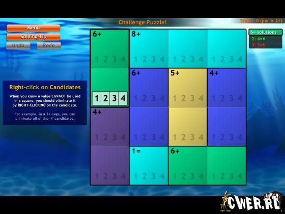 Игра представляет собой превосходный сплав головоломок судоку и кен-кен. От игрока требуется заполнить поле цифрами так, чтобы по любой горизонтали или вертикали каждая цифра встречалась только 1 раз. Подсказки расставлены на поле по разноцветным зонам в виде несложных арифметических уравнений - при этом игроку не придётся тратить много времени на их решение, можно сосредоточиться на логической расстановке цифр.