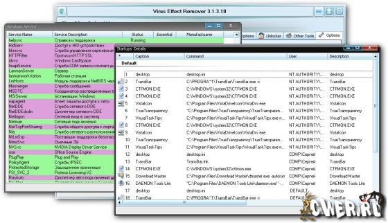 Virus Effect Remover - это инструмент который поможет вам справиться с последствиями вирусной аттаки, повлекшей за собой изменение в Реестре Windows и Файловой системе. Так же определяет ошибки реестра сделанные вирусом и делает доступными: диспетчер задач, редактор реестра, свойства папки, и т.д.