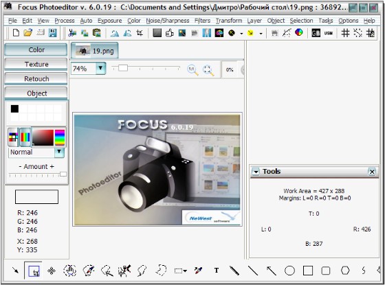Focus Photoeditor - мощный и легкий в использовании редактор изображений, который вы сможете использовать для обработки и коррекции цифровых фотографий, а также для создания графики для ваших веб-сайтов, дома и офиса. Вы сможете получать фотографии с жесткого диска, другого приложения, а также с помощью сканера или фотокамеры и начинать их немедленную обработку в данном редакторе. В программе имеются функции для автоматического преобразования фотографий за один клик, благодаря чему вы сможете улучшить ваши фотографии за считанные секунды. Также вы сможете самостоятельно отредактировать внешний вид изображений при помощи встроенных в программу инструментов. Focus Photoeditor является неплохим выбором для новичка и для профессионального фотографа, т.к. в нем сочетаются множество качественных функций легких в использовании и настройке.