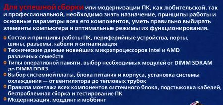 Материал книги поможет вам правильно подобрать модули, узлы и детали, необходимые для сборки компьютера желаемой конфигурации, либо для модернизации уже имеющегося ПК. В ней дано подробное описание системных плат, чипсетов, микропроцессоров, модулей оперативной памяти и блоков питания. Продуманная методика подачи материала позволит даже новичку успешно собрать в домашних условиях настольный ПК практически с нуля.