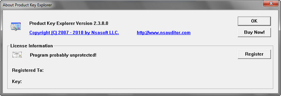 Product Key Explorer - позволяет расшифровать и увидеть, а также сохранить серийные номера (Product ID, Product Key, License Info, User Name, Company) продуктов Microsoft, CD-key установленных на компьютере программ, и не только их. Неполный список ПО, регистрационные данные которых можно увидеть и сохранить: Micrsoft Windows (2000, XP, 2003, Vista), Microsoft Office 2003, Microsoft Office 2007, Microsoft Office XP, Micrsoft Visual Studio 2005, Macromedia, Ahead Nero, Adobe Photoshop, CyberLink PowerDVD, Borland Delphi и т.д.