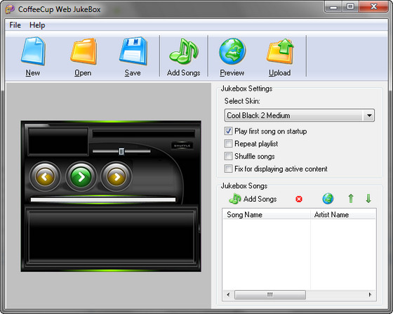 CoffeeCup Web JukeBox offers you flexibility and creativity in creating your JukeBox on the Web the way you want. You can add an unlimited number of songs and organize them how you wish — by the artist's name or album title, it's totally up to you! Everything from a simple stereo and buttons to an iPod design can be placed on your Website. Web Jukebox has big players, small players, and everything in between. You will love it!
