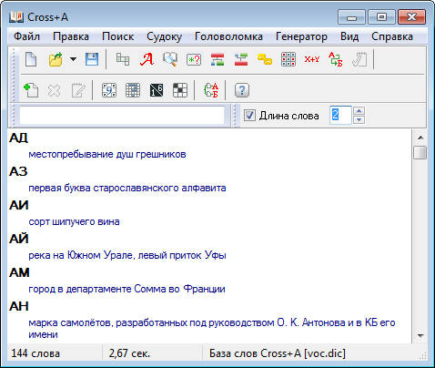 Компьютерная программа Cross+A предназначена для решения кроссвордов, сканвордов, криптарифмов, судоку и японских кроссвордов (черно-белых и многоцветных нонограмм), а также для поиска анаграмм, словосочетаний, цепочек слов и метаграмм.