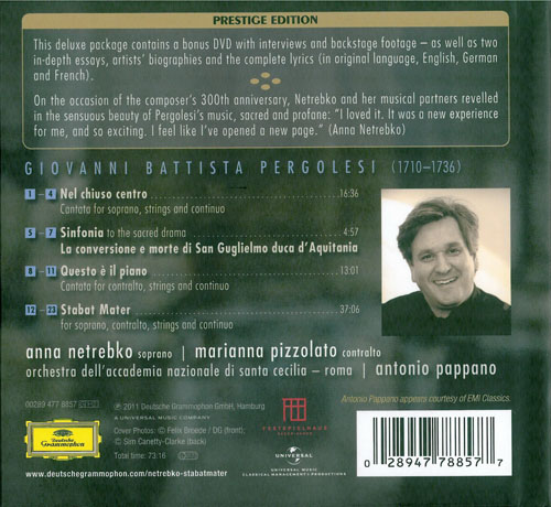 Анна Нетребко и Антонио Паппано снова вместе - на этот раз на диске, посвящённом трёхсотлетию Джованни Баттисты Перголези. Наличие таких имён на обложке гарантирует качество и означает, что новомодного аутентизма внутри вы совершенно точно не найдёте. Паппано уверенной рукой ведёт Оркестр Национальной академии Санта-Чечилия, музыкальным руководителем которого он является с 2005 года. Что касается Нетребко, можно сколько угодно спорить о том, превосходит ли её сценическая харизма вокальные данные или нет, но с необычным для неё барочным репертуаром она справилась на весьма достойном уровне.