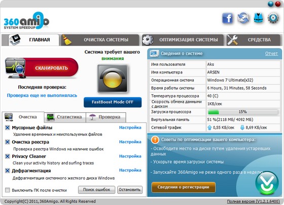 Думаете, что Ваш ПК слишком медленный? 360Amigo System Speedup может быстро вычислить и исправить широкий спектр ошибок и ускорит работу Вашего медленного ПК. 360Amigo System Speedup определяет и удаляет на Вашем компьютере все неиспользуемые файлы, оставшиеся от неправильной установки / удаления программ, он оптимизирует Ваш Windows, тем самым ускоряя время запуска системы. Кроме того, эта программа препятствует запуску вредоносных процессов на Вашем ПК. Также, она удаляет следы Вашей он-лайн активности, а именно историю просмотра, cookie-файлы, временные файлы, журнал регистраций, неверные ссылки и многое другое. Но самое главное в этой программе это то, что она мало весит, невероятно быстра и действенна (обычно её прогон занимает менее минуты). 360Amigo System Speedup выжмет максимум из Вашего ПК и сделает его снова как новым. Доступными функциями и возможностями этой программы смогут наслаждаться как новички, так и опытные пользователи.