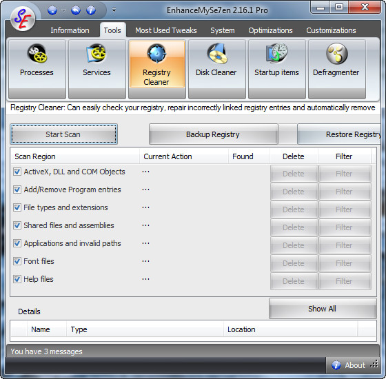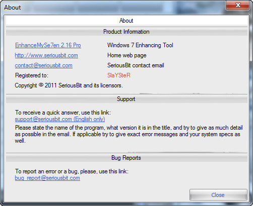 EnhanceMySe7en включает в себя менеджер автозагрузки, менеджер процессов, модуль очистки жесткого диска, дефрагментатор жесткого диска, "чистильщик" системного реестра, монитор жесткого диска (температура, время работы, серийный номер и т.п.), модуль настройки интернет-соединения, а также средства для быстрого доступа к "тонким" настройкам операционной системы.