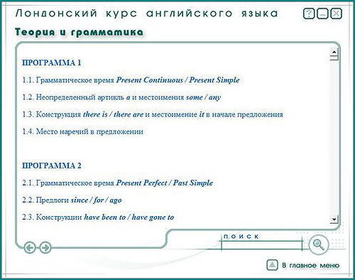 - Лексические разделы включают в себя слова и выражения, отрабатываемые в каждой программе. Большое внимание уделено наиболее сложным лексическим единицам - глаголам, предлогам, идиомам.