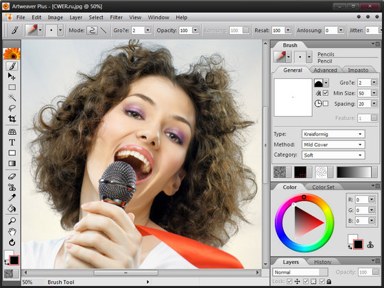 Artweaver по внешнему виду напоминает Photoshop - те же панели истории и слоев, палитра инструментов, область предварительного просмотра. Однако, в отличие от графического редактора от Adobe, эта программа содержит только инструменты для рисования. Используя их, можно раскрашивать изображения кистями, добавлять текст, заливку и градиент, рисовать линии, производить обрезку и т.д. Есть даже инструменты "штамп" и "волшебная палочка". Artweaver содержит очень удобные средства для выбора цвета: его можно выбирать как на цветовом круге, так и из набора наиболее часто используемых цветов. Одним словом, это отличная программа для детей и начинающих художников.