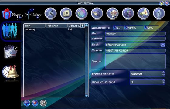 Happy Birthday – полезная программа для поздравления родственников, друзей и близких с любым праздником. Также программа напоминает когда и у кого именины или какой другой знаменательный день. В утилите очаровательный и понятный дизайн с множеством функций для напоминаний, поздравления и редактирования информации о контактах! Также вы можете получить данные от любого другого компьютера с помощью синхронизации.