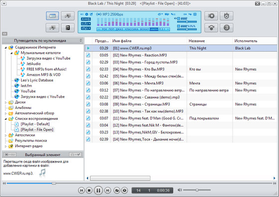 jetAudio - популярный проигрыватель мультимедиа файлов. Программа поддерживает огромное число форматов, среди которых: WAV, MP3, MP3Pro, OGG, WMA, MPG, AVI, WMV, MIDI, RM и другие. При помощи этой программы можно не только слушать и смотреть медиафайлы, а также накладывать звуковые эффекты, изменять скорость просмотра видео, оцифровывать аудио диски, преобразовывать файлы из одного формата в другой и многое другое. Разработкой данной программы занимается компания COWON известная в первую очередь своими аудио-плеерами (материальными). Такой функциональности, как у бесплатной версии плеера jetAudio подчас не бывает и у платных проигрывателей. Кроме всех своих функций, данный плеер обладает очень симпатичным и удобным интерфейсом, а также поддерживает работу с субтитрами и Flash-плеерами.