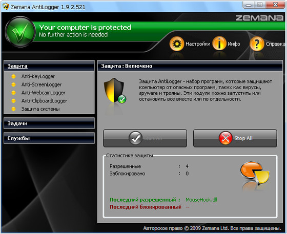 Zemana AntiLogger - мощный программный комплекс для защиты вашего ПК от наиболее опасных сетевых угроз, таких как KeyLoggers, ScreenLoggers, WebCamLoggers, ClipboardLoggers. Помимо обеспечения безопасности от вышеуказанных вредоносных программ, программа защищает доверенные компоненты системы от нежелательного доступа, например, инжекция dll/code, загрузка драйвера ядра, изменение физической памяти и т.д. Программа совместима со всеми популярными антивирусами и совершенно не влияет на производительность системы.
