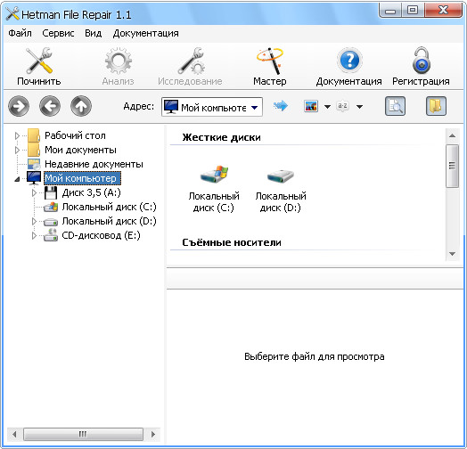 Hetman File Repair - утилита для восстановления файлов, поврежденных сбоем электропитания, фотокамеры, вирусной атакой, неудачной попыткой восстановления информации. Утилита восстанавливает поврежденные *.JPG, *.JPEG, *.JPE, *.JFIF файлы. Интерфейс программы напоминает стандартное окно Windows "Проводника", который отображает, доступные для исправления файлы. Так же в утилите реализован пошаговый мастер, который поможет восстановить и сохранить поврежденные файлы.