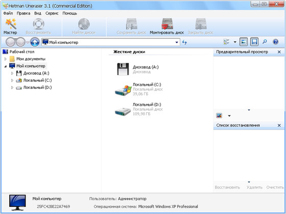 Hetman Uneraser - утилита для восстановления удаленных файлов с жестких дисков, USb флешек, карт памяти цифровых фотокамер, мобильных телефонов. Утилита восстанавливает не только случайно удаленные файлы, но и данные, утерянные после форматирования или удаления логического раздела. Интерфейс программы напоминает стандартное окно Windows "Проводника", который отображает, как существующие, так и удаленные файлы.