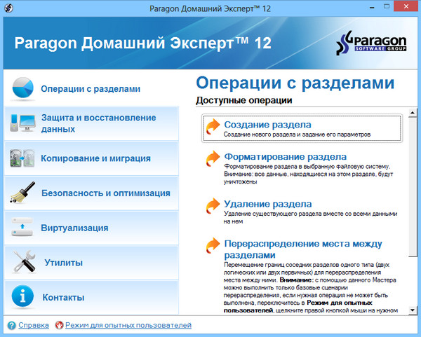 - Новая логика работы с жестким диском. Paragon разработал совершенно новую логику работы по сегментированию жесткого диска, что позволит использовать Домашний Эксперт 12 с самыми современными жесткими дисками.