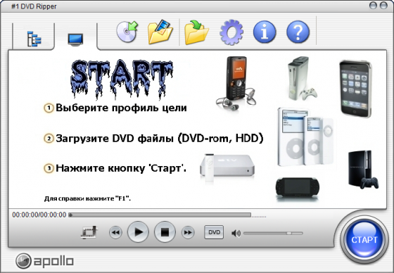 #1 DVD Ripper поддерживает: Apple iPod, iPhone, Apple TV, Microsoft Zune, Sony PSP, PS3, XBOX 360,Windows Mobile Pocket PC, Creative Zen Vision (and Vision M), Archos Media Player, HP iPAQ Pocket PC, Windows Smartphone, Video Cell / Mobile Phone, Windows CE handheld device.