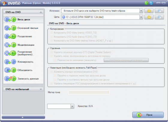 DVDFab Platinum – мощный, многофункциональный программный продукт для копирования DVD дисков с возможностями гибкой обработки видеопотока. Программа является одной из лучших на сегодняшний день, из инструментов для копирования, разбиения, пережатия и конвертирования DVD дисков с фильмами. Снимает все защиты и ограничения с диска и при желании пережмет диск большой емкости и вместит его в обыкновенную пустую DVD болванку с минимальными потерями качества (DVD9->DVD5) или разобъет фильм на два диска с полным переносом его меню, удалит всю рекламу, запишет только фильм и многое другое. Программа имеет интуитивно понятный, мультиязычный интерфейс включая русский.