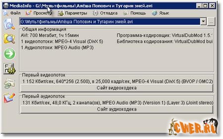 MediaInfo - программа, которая предоставляет подробную информацию об аудио и видео файлах. MediaInfo показывает, каким кодеком сжато видео, с каким битрейтом, какое в нем соотношение сторон и количество кадров в секунду. Для аудиофайла MediaInfo показывает используемый кодек, битрейт, язык, количество каналов, частоту выборки и т.д. Показав сведения о файле, программа тут же посоветует, где можно скачать недостающий кодек или проигрыватель.