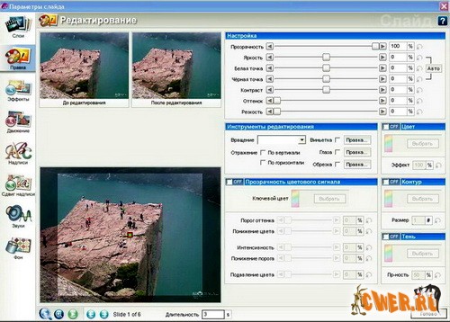ProShow поддерживает 100+ типов файлов в т.ч. PSD, PNG, TIFF , GIF и RAW, имееет встроенный редактор, с помощью которого можно избавиться от эффекта "красных глаз", добиться прозрачности разных слоев, раскрасить, тонировать, регулировать насыщенность, контраст, вращать, масштабировать, изменять положение камеры по осям Х, У и многое другое.