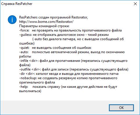 • Поддержка командной строки. С параметрами командной строки Вы можете без труда запускать Restorator из пакетной программы для автоматизированного выполнения. Также возможно включить Restorator или ResPatch в инсталляционные программы (типа InstallShield), чтобы автоматизировать внесение исправлений в ресурсы в процессе инсталляции.