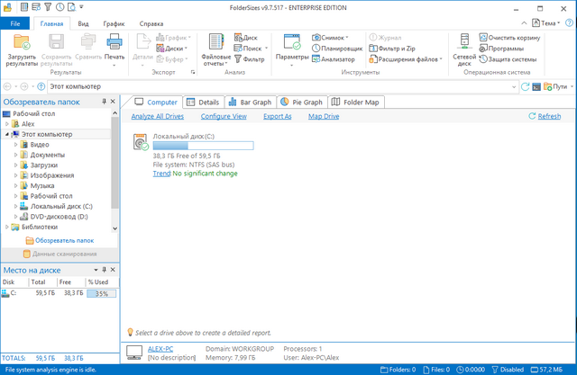 С помощью программы FolderSizes вы сможете определить количество свободного места на жестком диске. FolderSizes предоставляет подробную информацию о размере папок и файлов по каждому разделу жесткого диска. Кроме этого, программа использует диаграммы для наглядности. Используя данный программный продукт, вы сможете найти файлы, удаление которых позволит освободить свободное место и, в то же время, не повлияет на работоспособность операционной системы.