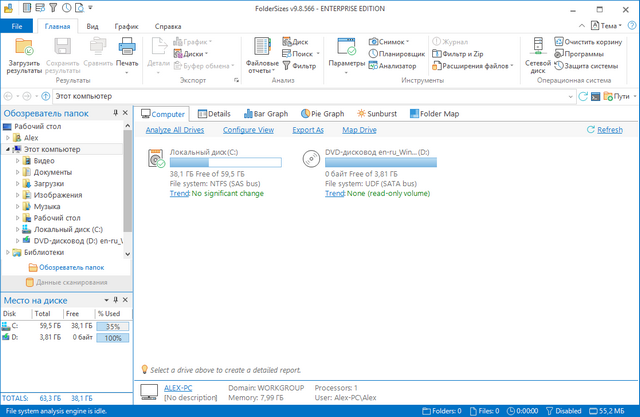 - Просмотр общего и свободного пространства для стационарных, съемных и сетевых дисков