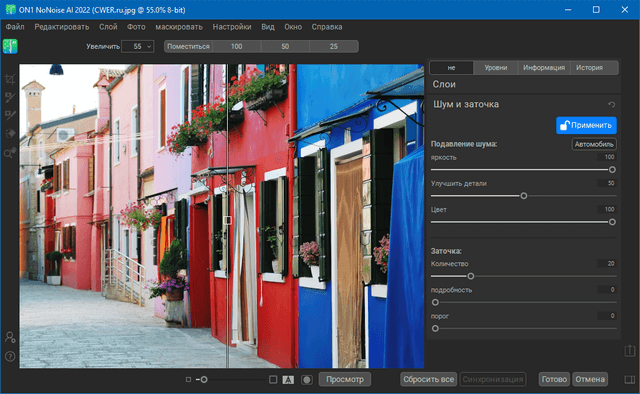 - Авто с предпочтениями пользователя - кнопка Авто проанализирует фотографию и определит правильную величину шумоподавления с использованием моделей AI ON1.