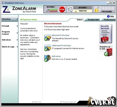 » Удобен в установке и использовании. ZoneAlarm Antivirus легко устанавливается и запускается, а интуитивно понятный интерфейс поможет настроить программу, исходя из Ваших потребностей