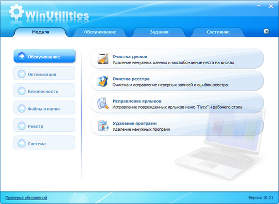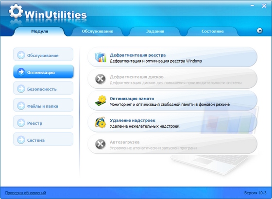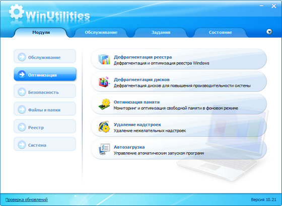 WinUtilities - набор утилит для настройки системы семейства Windows. Содержит более 20 инструментов для оптимизации и настройки производительности операционной системы. Предлагает удобный в использовании интерфейс, который организует все задачи по категориям и предоставляет графическую статистику там, где это возможно.