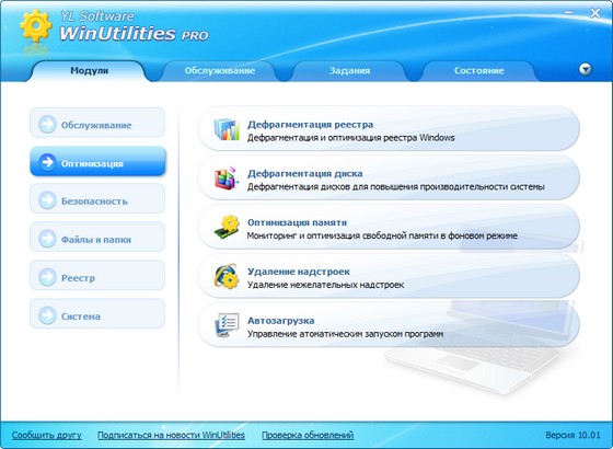 WinUtilities содержит пакет утилит для настройки и оптимизации Вашей операционной системы. Программа позволяет находить и удалять критические неисправности, неправильные ссылки и ключи в реестре, поможет правильно удалить приложения и программы, а также очистит историю интернета, cookies и многое другое. Также в программе есть возможность настроить автозапуск программ и изменять скрытые опции ОС.