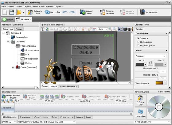 AVS Disc Authoring - легкая в использовании программа для авторинга и записи DVD дисков. В программе есть возможность, создания и редактирования меню, разделение фильмов на разделы, добавление нескольких звуковых дорожек, добавление субтитров и многое другое.